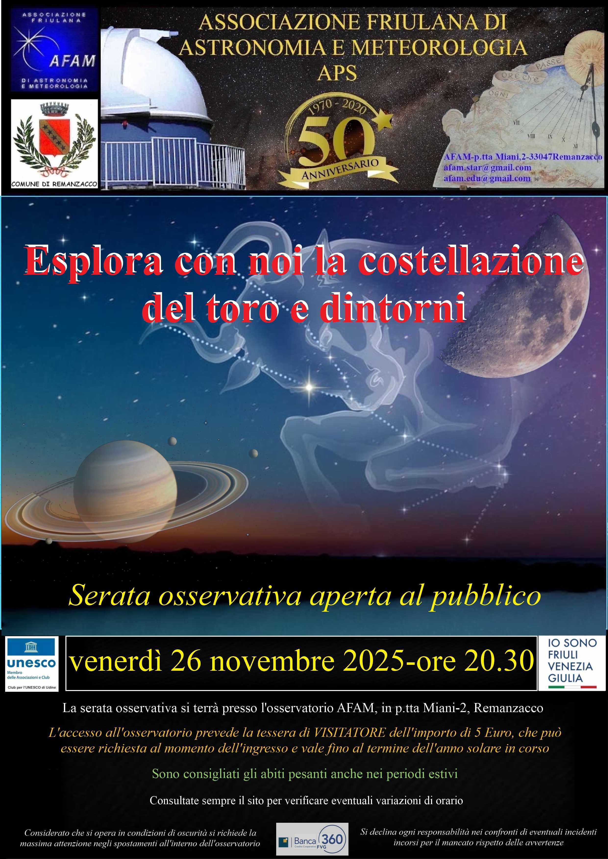 La sede e l'osservatorio dell'A.F.A.M. sono in P.zza G.Miani, 2a, 33047Remanzacco (UD)
