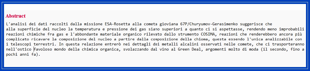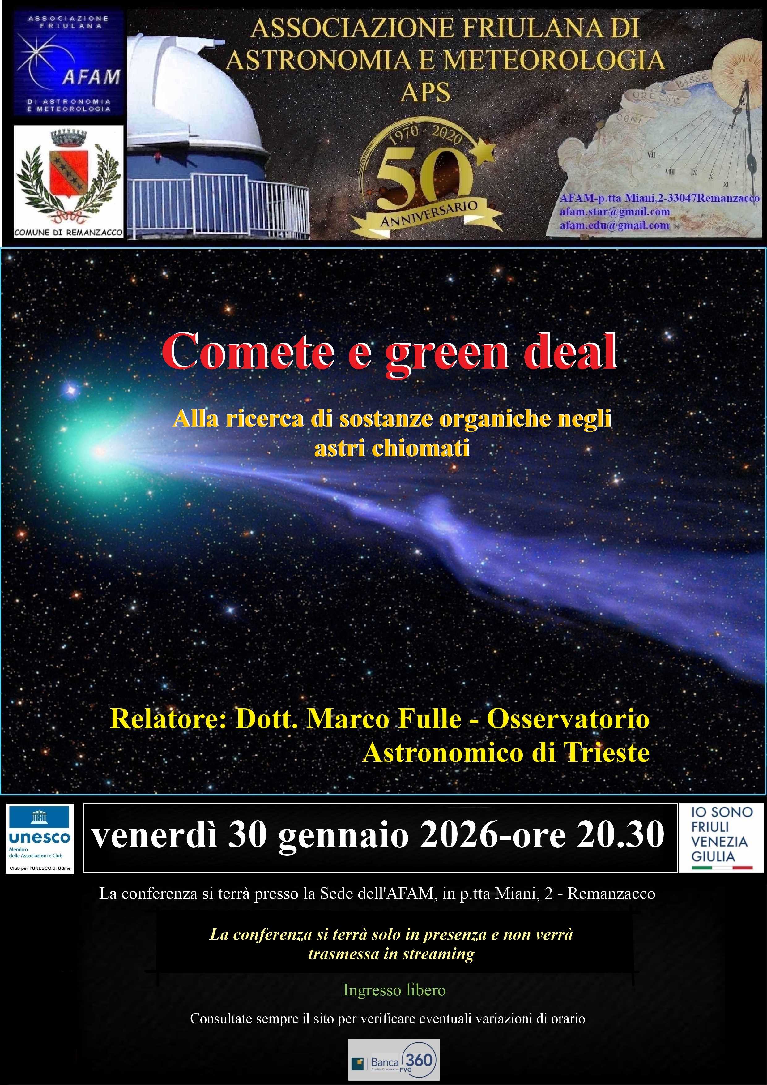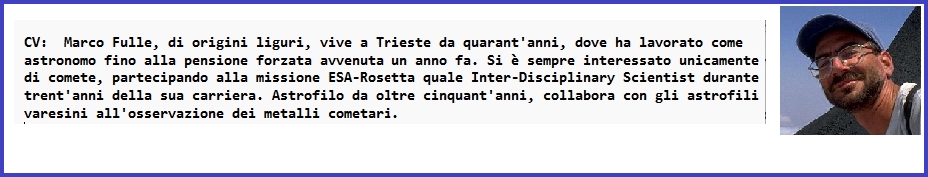 COMETE E GREEN DEAL Alla ricerca di sostanze organiche negli astri chiomati. L'evento si terrà solo in presenza e non verrà trasmesso in streaming Conferenza interna aperta al pubblico Relatore: Dott. Marco Fulle - Osservatorio Astronomico di Trieste abstract CV |