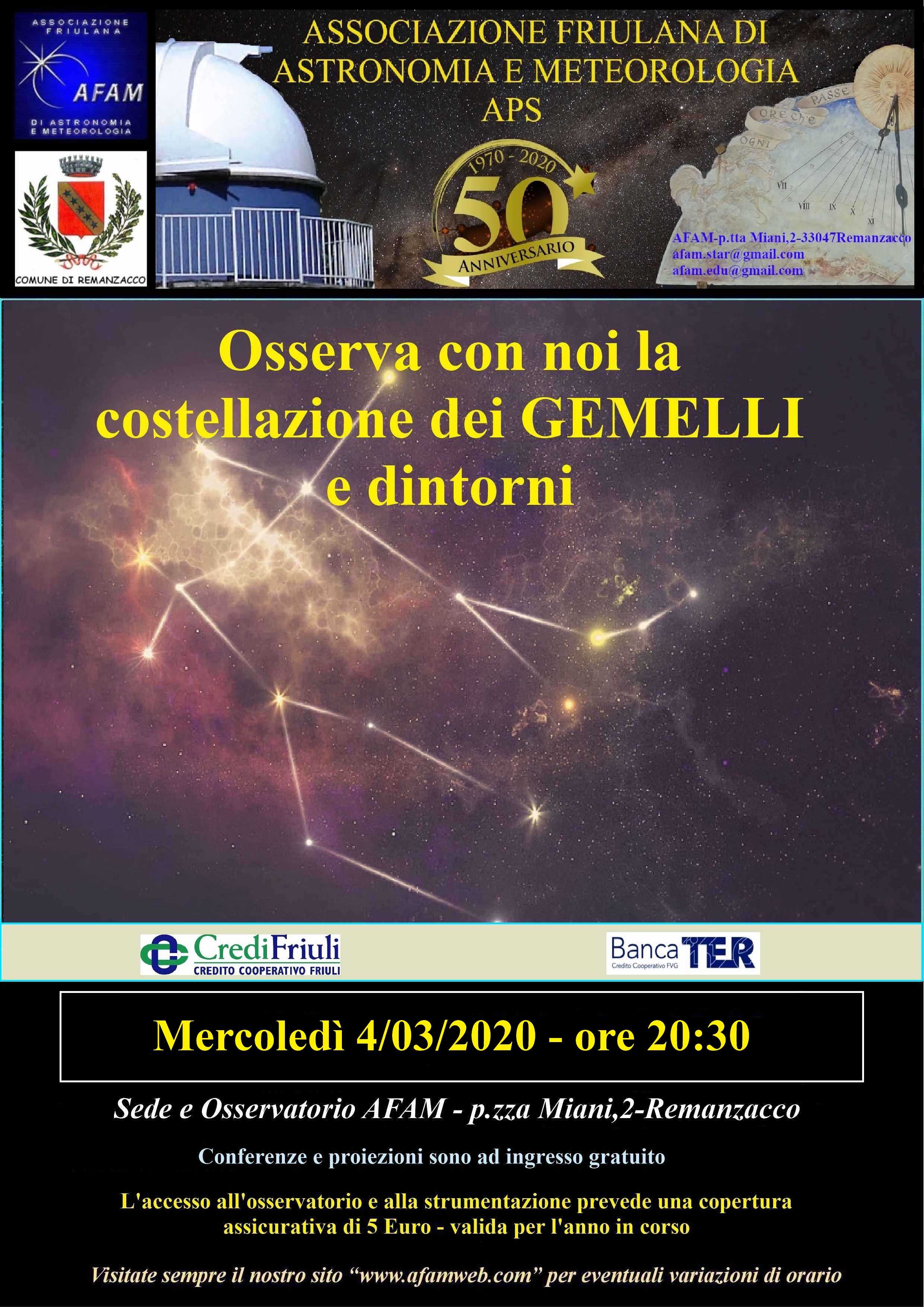 20:30 23:30 | SERATA OSSERVATIVA CANCELLATA Osserva con noi la costellazione dei Gemelli e dintorni |