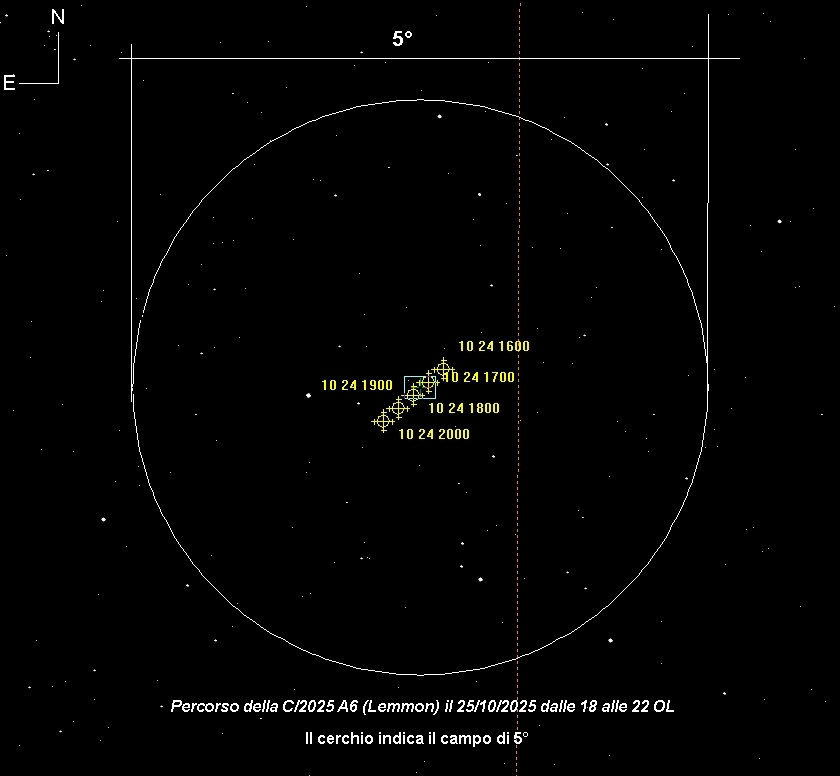 OSSERVATE LA COMETA C/2025 A6/LEMMON L'oggetto è ben rintracciabile la sera dopo il tramonto del Sole Cartina del campo di 5° Cartina del persorso Informazioni sull'orbita |