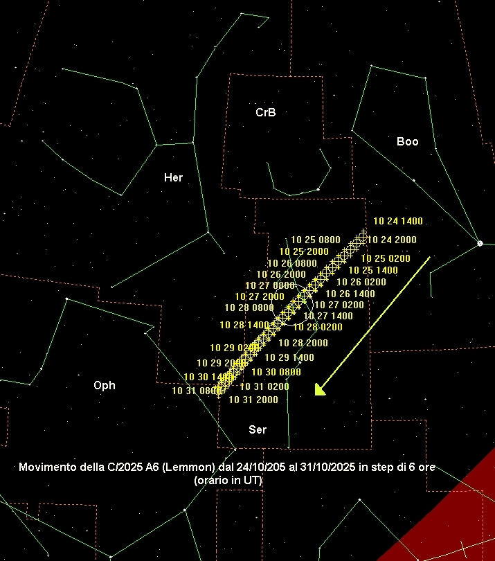 OSSERVATE LA COMETA C/2025 A6/LEMMON L'oggetto è ben rintracciabile la sera dopo il tramonto del Sole Cartina del campo di 5° Cartina del persorso Informazioni sull'orbita |